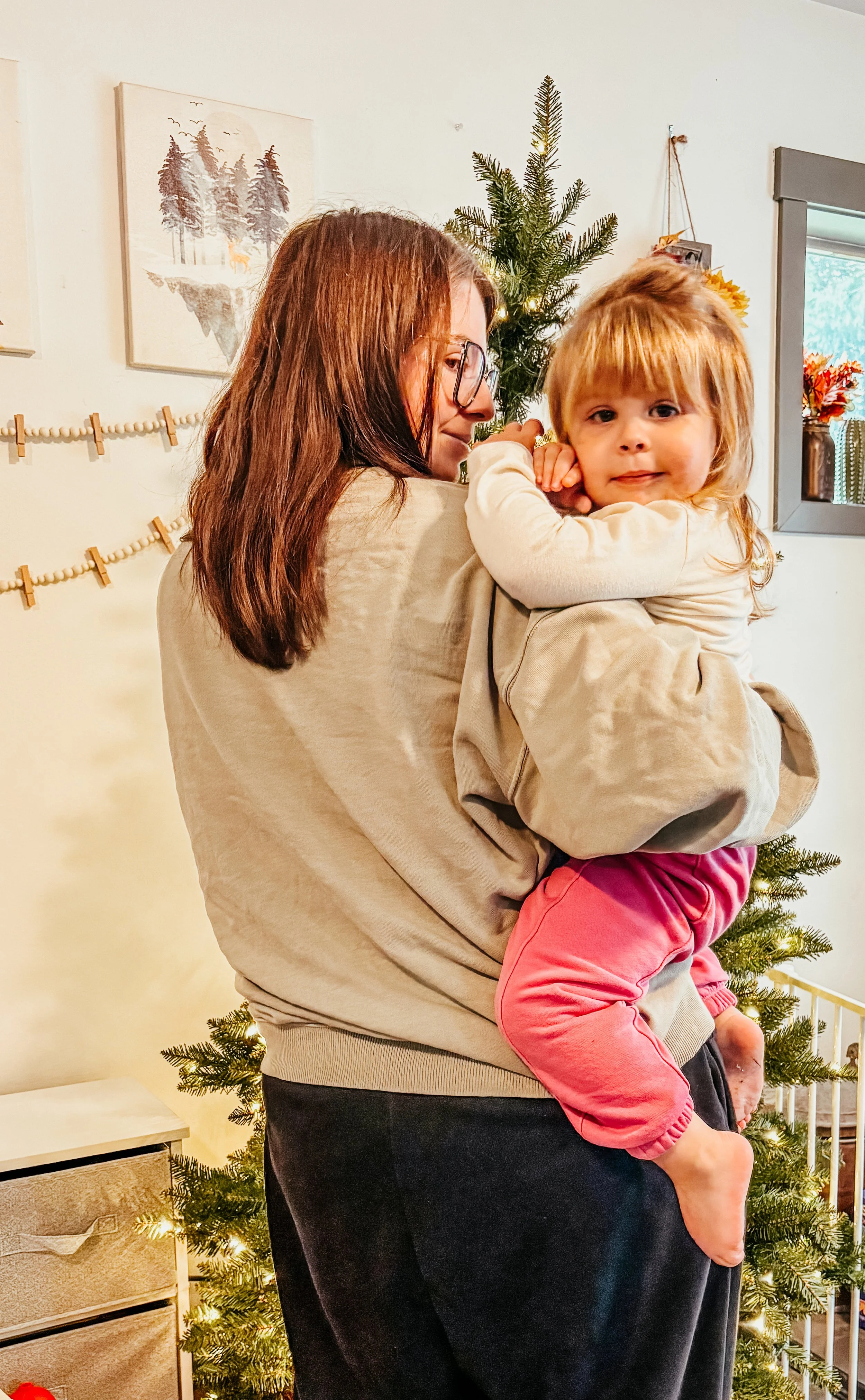 Together, we fluffed the branches, got it plugged in, and put on the tree skirt.